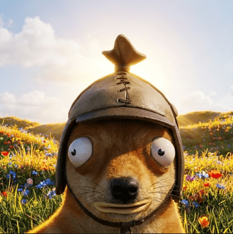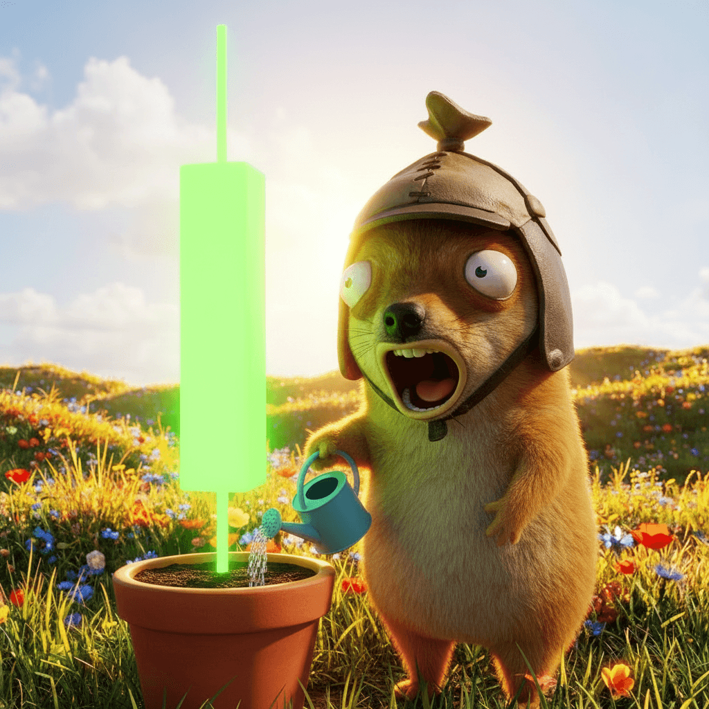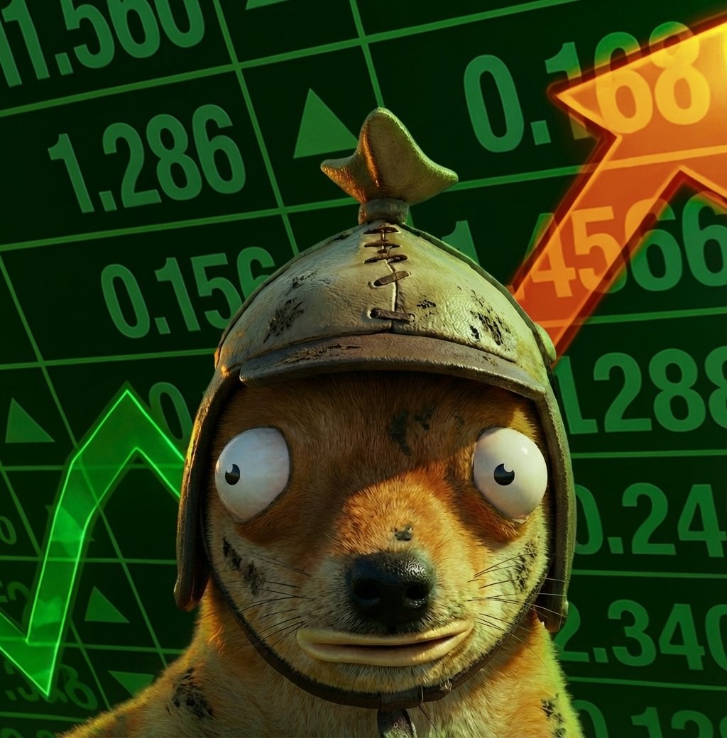 He’s a small, scruffy weff in a battered bronze helmet, with big, panicked eyes like he’s staring at a 90% red candle—but behind that confused look there’s insane trading instinct.